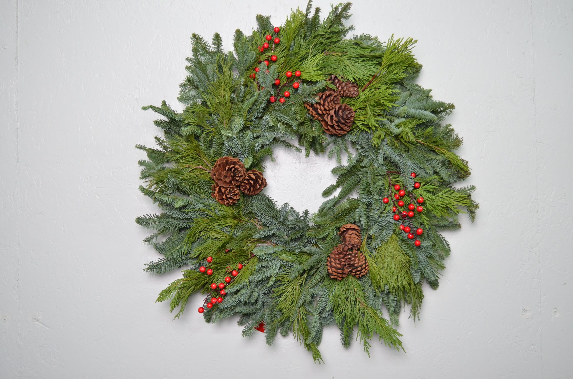 28" Noble Fir Wreath w/ Pinecones and artificial red berries
